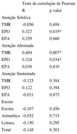Na tabela 4 são apresentadas as relações da aptidão aeróbia com os testes de atenção (seletiva, alternada e sustentada) e desempenho escolar (escrita, aritmética, leitura e escore total). A aptidão aeróbia foi positiva e fracamente relacionada com EPO para a atenção seletiva e alternada, e com o TMR para a atenção alternada. Não foram encontradas relações com as demais variáveis atencionais e com o desempenho escolar (escrita, aritmética, leitura e escore total).