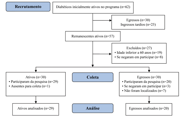 Dos 62 diabéticos que integravam o programa inicialmente, 30 indivíduos se retiraram e foram eleitos para compor a amostra dos egressos. Concomitantemente, 25 participantes se juntaram aos 32 remanescentes e, destes, 30 foram eleitos para compor a amostra dos ativos, totalizando 60 idosos selecionados para a coleta. Após perdas amostrais, apenas 49 dos 60 idosos foram incluídos no estudo, sendo 29 ativos e 20 egressos (Figura 1).