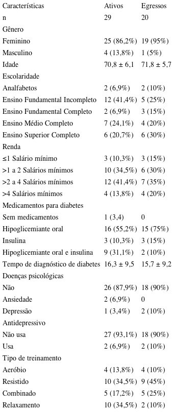 No momento da coleta, dentre os 29 participantes do grupo ativo, 16 encontravam-se no programa há pelo menos 12 meses, 8 há 6 meses e 5 há 3 meses. Dos 20 desistentes, 9 abandonaram o programa há pelo menos 6 meses, 7 há 3 meses e 4 há pelo menos 1 mês. As coletas com os idosos ativos foram realizadas em um dos dias de intervenção do Programa Doce Vida, com os egressos foram marcados horários, por meio de ligações telefônicas, para responderem os questionários na ESEF. As características gerais da amostra se encontram na Tabela 1.