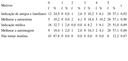 Concernente aos motivos intrínsecos, com exceção de um estudo que mostrou que a adesão de diabéticos pode ser melhorada estimulando-se a motivação intrínseca por motivos intimamente ligados a fatores motivacionais22, os achados do estudo aqui apresentado não corroboram a literatura atual a qual vem demonstrando que os fatores extrínsecos são os principais motivos que levam idosos diabéticos a se exercitarem16,17,20,21.