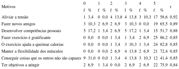f: distribuição de frequência dos motivos; %: valor em porcentagem da distribuição de frequência; r: fator de correlação.