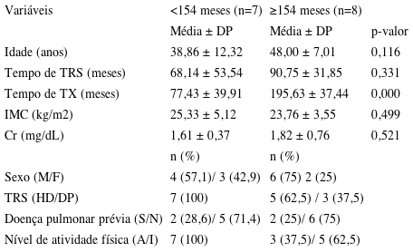 Considerando que os grupos foram semelhantes entre si para as variáveis acima mencionadas, exceto pelo tempo de transplante e nível de atividade física, as características individuais dos voluntários de cada grupo estão representadas nas Tabelas 2 e 3. Houve prevalência do sexo masculino em ambos os grupos, com média de idade 38,86 ± 12,32 anos para o grupo <154 meses e 48,00 ± 7,01 anos no grupo ≥154 meses.