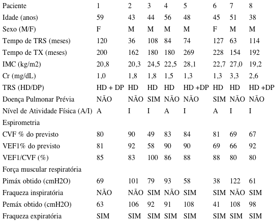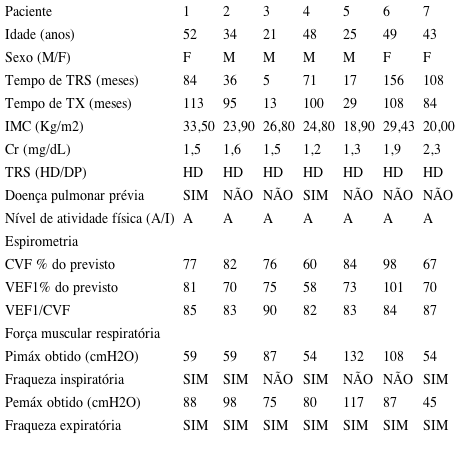 Legenda: M=masculino; F=feminino; TRS = Terapia renal substitutiva; Tx = Transplante; IMC= Índice de massa corporal; Cr = Creatinina; HD = Hemodiálise; DP = Diálise peritoneal; A= Ativo; I=Inativo; CVF = Capacidade vital forçada; VEF1 = Volume expiratório forçado no primeiro segundo; Pimáx= Pressão inspiratória máxima; Pemáx = Pressão expiratória máxima.