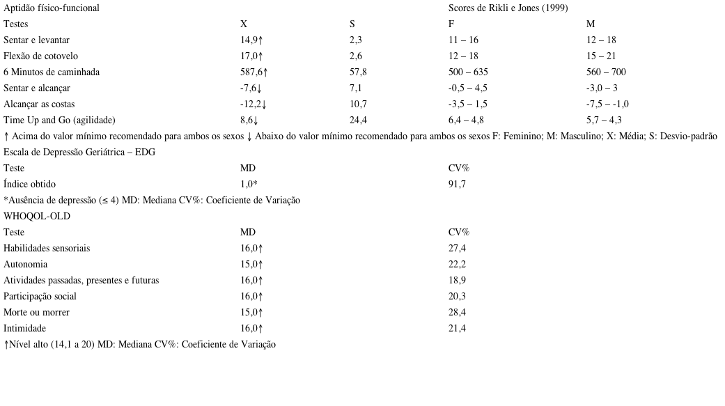 Os resultados dos testes de aptidão físico-funcional de Rikli e Jones, Escala de Depressão Geriátrica (EDG) e Questionário de Qualidade de Vida da Organização Mundial da Saúde para Idosos (WHOQOL-OLD) estão apresentados na Tabela 2.