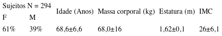Participaram do estudo 294 voluntários (179 mulheres – 61%), com idades entre 60 e 86 anos (68,6±6,6 anos; 68,0±16,5 kg, 162,0±0,1 cm), frequentadores de dez RALs da cidade do Rio de Janeiro (RJ, Brasil) há no mínimo três e, no máximo, 12 meses. Para a seleção da amostra foram adotados os seguintes critérios de exclusão: a) restrições médicas para a prática de exercício físico; b) deficiência motora ou cognitiva impeditiva da aplicação das atividades previstas (questionário e teste de campo); c) problemas osteomioarticulares que comprometessem a realização dos testes; d) frequência inferior a 80% das sessões de treinamento no período de participação nas atividades.