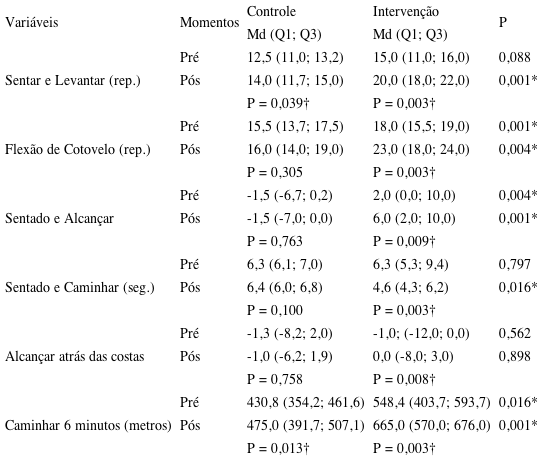No FC, houve diferença significativa entre os grupos tanto no pré-teste (p=0,001) quanto no pós-teste (p=0,004), evidenciando que em ambos os momentos as idosas do grupo intervenção realizaram mais repetições. No entanto, destaca-se que apenas o grupo intervenção apresentou aumento significativo (p=0,003) no número de repetições do pré- para o pós-teste. No SA, houve diferença significativa entre os grupos tanto no pré-teste (p=0,004) quanto no pós-teste (p=0,001), evidenciando que em ambos os momentos as idosas do grupo intervenção realizaram mais repetições. No entanto, destaca-se que apenas o GI apresentou aumento significativo (p=0,009) no número de repetições do pré- para o pós-teste.