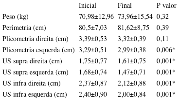 A Tabela 3 apresenta as comparações entre o lado controle (direito) e tratado (esquerdo), observou-se que o lado esquerdo apresentou uma redução significativa, comparado ao direito, nas medidas de plicometria, ultrassonografia supraumbilical e infraumbilical.