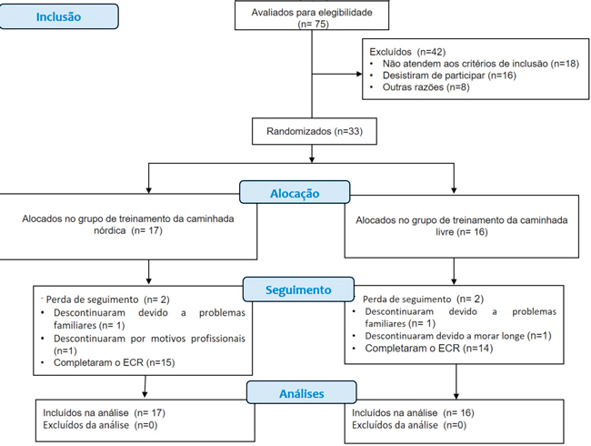 O tamanho da amostra foi calculado antes do início do estudo, usando o software G-Power, para Windows, versão 3.1.9.2. Foi adotado um nível de significância de 0,05, um poder com 1-β probabilidade de erro de 95%, assumindo um α = 0,05, tamanho de efeito de 0,43, baseado nas médias e desvios-padrão do percentual de gordura do grupo caminhada nórdica e caminha livre do estudo de Song et al. (2013). O resultado do tamanho amostral foi o de 14 participantes para cada grupo, porém considerando uma possível perda amostral, selecionaram-se 75 voluntários, restando, destes, 33 participantes (CN, n = 17) (CL, n = 16).