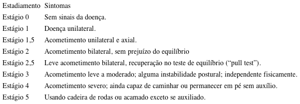 O estadiamento da doença foi avaliado com a escala Hoehn e Yahr (H&Y), também validada para a população brasileira21. Esta escala possui oito estágios, do 0 (sem sinais da doença) até o 5 (uso de cadeiras de rodas e/ou acamado) de acordo com a gravidade da DP, como podem ser observados no Quadro 1: