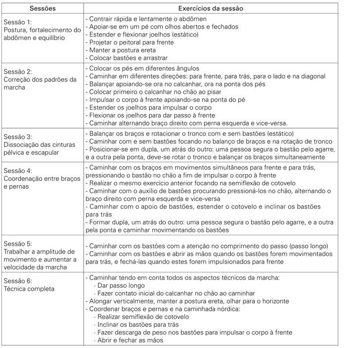 Durante seis semanas, os sujeitos compareceram à Escola de Educação Física, Fisioterapia e Dança (EsEFID-UFRGS) para a realização das 12 sessões de treinamento de CN e de CL, com a frequência de duas vezes por semana, em dias não consecutivos, com a duração inicial de 35 minutos diários, com progressão até 50 minutos no total, no último ciclo de treinamento, totalizando 12 sessões. Os participantes de ambos os grupos fizeram seis sessões de familiarização da caminhada e correção da técnica (Quadro 2)(Figura 1). Os mesmos exercícios foram realizados nos dois grupos, porém no grupo da caminhada nórdica foi introduzido o uso do bastão (Newfeel® – Decathlon, Nordic Walker, China) que foi ajustado individualmente conforme a estatura corporal. O protocolo de familiarização e ensino da técnica de CN foi realizado segundo o estudo de Arcila et al.15.