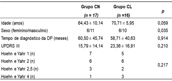 A avaliação dos sintomas motores e o estadiamento da DP foram realizados por um avaliador experiente, por meio das escalas UPDRS, Hoehn & Yahr (H&Y), respectivamente. A escala UPDRS – III, validada para a população brasileira20, contém 14 itens correspondentes à sessão de exploração motora que contemplam os seguintes domínios: fala, expressão facial, tremor de repouso, tremor postural e de ação das mãos, rigidez, movimentos manuais, agilidade das pernas, levantar da cadeira, postura, marcha, estabilidade postural e bradicinesia e hipocinesias corporais, cujos escores variam de 18 a 31, de forma que quanto maior o escore, maior o comprometimento.