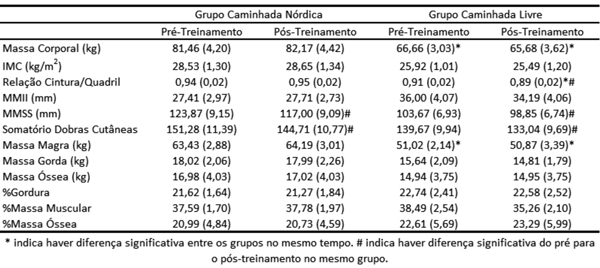 Abstract: Introduction: Parkinson’s disease (DP) is characterized by motor disorders, increasing risk of falls and physical inactivity. Objective: To analyze the anthropometric profile and body composition of subjects before and after participating in a Nordic Walking (NW) or Free Walking (FW) training program. Methods: A total of 33 patients were randomized into two experimental groups, NW (n = 16) and FW (n = 17), to perform the 12 training sessions. Results: Waist-hip ratio was reduced (2.2%, p = 0.022) for FW. The total number of skinfolds was reduced by 4.3% in the NW group (p = 0.012) and 4.7% in the FW group (p = 0.012). However, the training period did not promote significant changes in body mass (p = 0.808), in IMC (p = 0.392), lean mass (p = 0.834), adipose mass (p = 0.721) and bone mass (p = 0.348), nor in the percentages of adipose mass (p = 0.887) in any of the groups. Conclusion: The training promoted an effective anthropometric improvement for both groups.