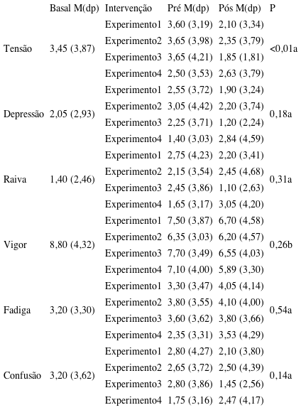 Os valores das variáveis negativas raiva e fadiga permaneceram baixos em ambos os modos dos experimentos independentes das modificações das sessões, sem ocorrer redução dos valores, o que vai ao encontro da definição de raiva por Samulski16 como algo que surge quando uma meta que se acredita atingir não é obtida. Esse motivo parece não ter ocorrido nas intervenções, contribuindo para a sensação de eficiência e confirmando Laneiro et al.17 que encontraram relação negativa da tensão e da fadiga com a satisfação da tarefa.