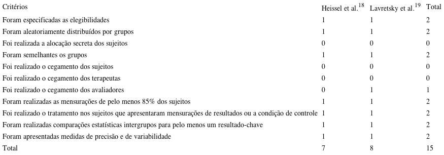 Com base nos critérios da Escala PEDro (Tabela 1), os artigos revisados foram classificados com moderada a alta qualidade (>6) com base no Physiotherapy Evidence Database15. Os critérios que foram menos contemplados correspondem ao cegamento das atividades, instrutores e avaliadores (critérios 5, 6 e 7). Entretanto, é mais difícil cegar os participantes quando é utilizado o exercício físico como intervenção, considerando que os indivíduos analisados irão executar as atividades. Portanto, o escore obtido foi acima da média atual dos artigos indexados na presente escala (5,1 pontos), conforme a publicação do Physiotherapy Evidence Database15. (Figura 1)