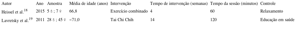 Conforme apresentado na Tabela 2, o período de intervenção variou de 4 a 14 semanas. A sessão dos exercícios físicos teve duração de uma até duas horas. Um estudo18 mostrou um treinamento combinado (aeróbio e anaeróbio) como estratégia de intervenção, e o outro19 utilizou o Tai Chi Chih (emprega a meditação através do movimento). Além disso, em uma pesquisa18, realizou-se o controle ativo (os participantes praticavam várias tarefas de relaxamento, com alongamentos dos principais grupos musculares), e em outra19 um protocolo de educação em saúde (implementado um manual que apresentava informações educativas e descrevia objetivos de aprendizagem e atividades para promover a integração do material). Todos os participantes utilizavam algum medicamento.