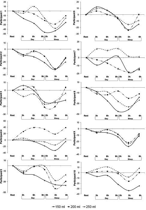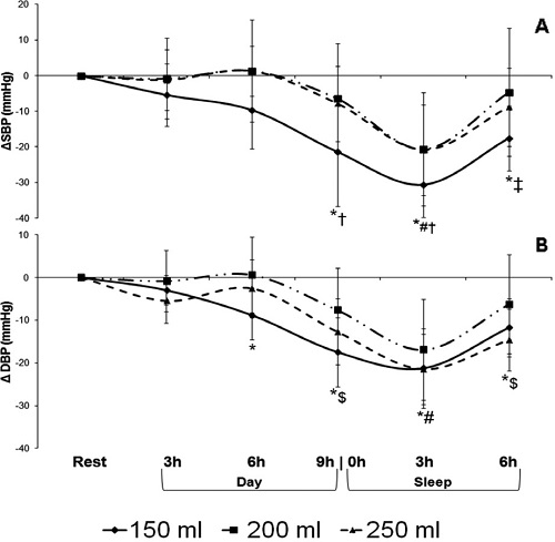 Source: Authors.During the sleep period, a greater reduction was seen in the interval from 9 to 12 hours after RW ingestion, with reductions of up to -20.8 ± 11.0 mmHg for 250 ml, -19.3 ± 5.0 mmHg for 200 ml and -17.7 ± 15.0 for 150 ml.