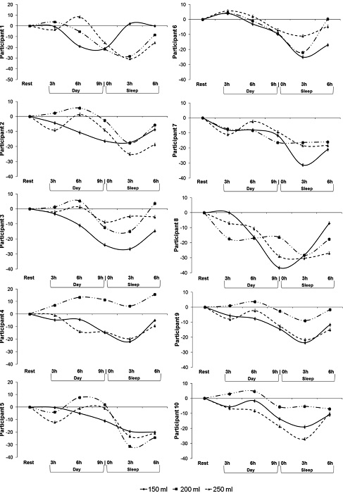 Source: Authors.Figure 2 shows the intra-individual absolute variation of SBP (ΔmmHg) during the total period of 15 h of ABPM in the three conditions (150 ml, 200 ml and 250 ml of RW).