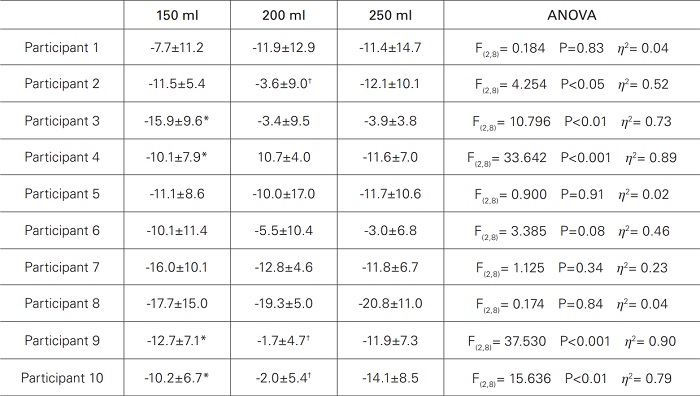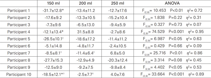 Descriptive statistics was used with mean and standard deviation. All the variables were in absolute variation (Δ = difference between the periods and rest). After assessing and finding the normality of data distribution with Shapiro- Wilk test, the two-way ANOVA for repeated measures was used to verify the main effects of the interaction ‘time’ (Rest, 3h, 6h, 9h, 12h and 15h)*, condition (150ml, 200ml and 250ml) and the main effects on time under the different conditions. The values of ‘F-ratio’, degrees of freedom and ‘p’ were reported.