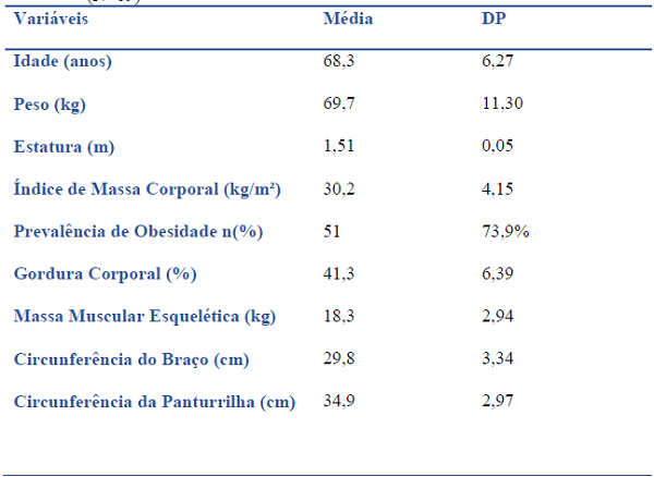 Na TABELA 1 são apresentados os dados obtidos a partir da avaliação corporal da amostra, composta por 69 idosas.