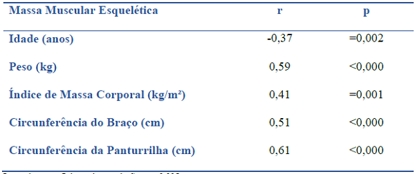 Fonte: Autores.Na TABELA 2 vemos a correlação da massa muscular esquelética (MME) estimada pela bioimpedância com as variáveis da composição corporal. A circunferência do braço (CB) e circunferência da panturrilha (CP) foram as medidas que mais correlacionaram com a MME, apresentando uma correlação moderada, enquanto as outras medidas de circunferência tiveram fraca correlação. O peso também apresentou correlação moderada com a MME.
