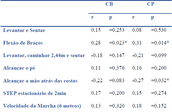 Resultados: correlação positiva e significante entre a CP e CB com a MME (r=0,61 e r=0,51, p<0,001, respectivamente). Quanto à funcionalidade, apenas o teste de flexão de braço se correlacionou com a CP e CB (r=0,31 e r=0,28, p<0,05, respectivamente).