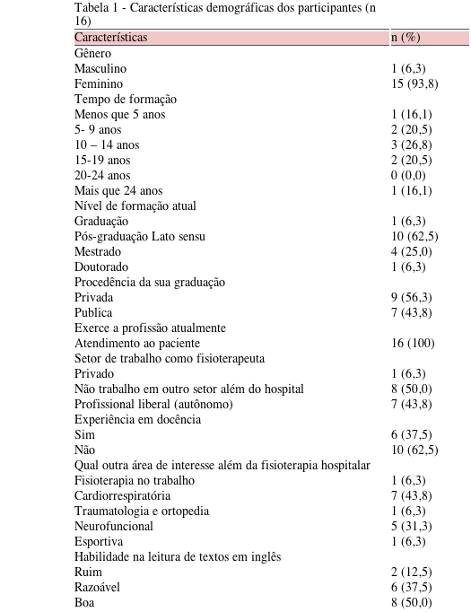 A taxa de resposta ao questionário do estudo foi de 72.72% (16 respondentes). A Tabela 1 apresenta os dados demográficos dos participantes. A maioria dos participantes são do sexo feminino (93,8%), com tempo de formação entre 10 e 14 anos, formados em instituição privada (56,3%) e com pós-graduação lato sensu (62,5%). Oito deles (50%) declararam ter boa habilidade na leitura de textos em língua inglesa. Todos atuam com o atendimento ao paciente no ambiente hospitalar. Seis deles (37,5%) têm experiência com docência. A área de maior interesse, além da fisioterapia hospitalar, é a cardiorrespiratória (43,8%).