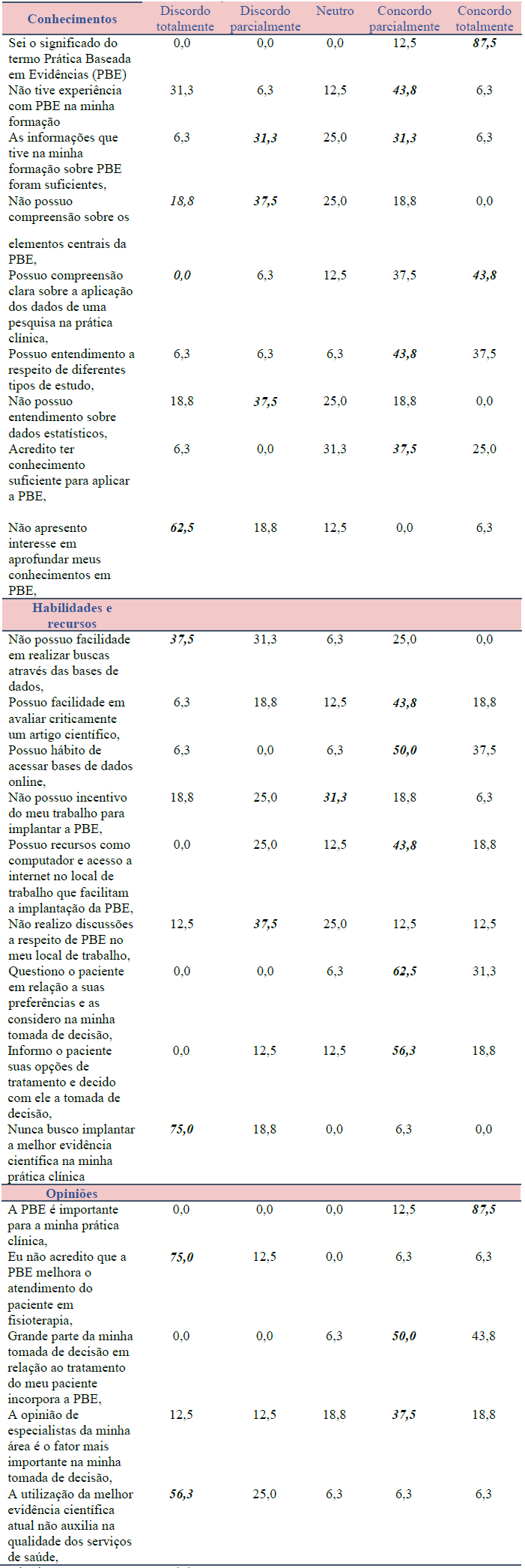 A Tabela 3 apresenta os resultados quanto a conhecimento, habilidades, recursos e opiniões em relação à PBE. Em relação ao conhecimento, 87,5% dos participantes relataram que sabem o significado do termo PBE, apesar de que 43,8% não tiveram experiência em PBE durante sua formação. A maioria dos participantes declarou acreditar ter conhecimento suficiente para aplicabilidade da PBE (37,5% concordaram parcialmente e 25% concordaram totalmente) e 62,5% declararam interesse em aprofundar seus conhecimentos em PBE.