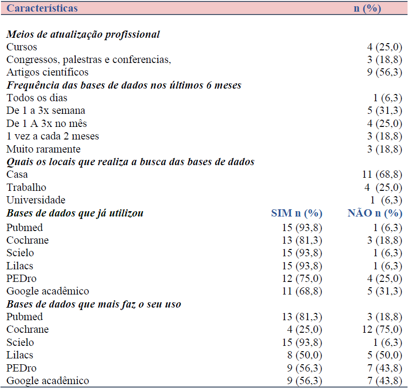 A Tabela 2 descreve o comportamento dos fisioterapeutas hospitalares em relação à PBE. O meio de atualização profissional mais utilizado são os artigos científicos (56,3%), sendo que 25% dos participantes apontaram acessar as bases de dados de uma a três vezes por mês. As bases já utilizadas foram Scielo, Pubmed e Lilacs (93,8%), sendo que a base mais acessada foi a Scielo (93,8%), seguida da Pubmed (81,3%), geralmente no domicílio do profissional.