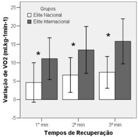 Os autores.Gráfico de barras apresentando média e desvio padrão da variação de VO2 (ml.kg- 1min-1) nos três minutos de recuperação (d de Cohen -1,156; -1,135; -1,471, respectivamente para os minutos 1º, 2º e 3º) analisados para os grupos EN (atletas de elite nacional) e EI (atletas de elite internacional).