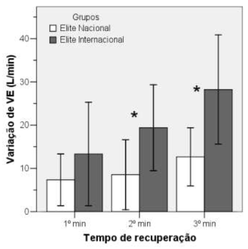 Os autores.Gráfico de barras apresentando média e desvio padrão da variação de VE (L/min) nos três minutos de recuperação (d de Cohen - 0,555; -1,143 e -1,359, respectivamente para os minutos 1º, 2º e 3º) analisados para os grupos EN (atletas de elite nacional) e EI (atletas de elite internacional).
