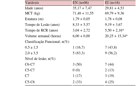 Foram incluídos no estudo 22 atletas de RCR, com idade = 31,27 ± 5,82 anos, massa corporal total = 70,25 ± 9,75 kg e estatura = 1,78 ± 0,07 m. Cerca de 64,0% tinham a CF maior ou igual a 2 pontos (ponto alto; mais funcionais) e 36,0% até 1,5 pontos inclusive (ponto baixo; menos funcionais). O tempo médio de prática da modalidade foi de 4,83 ± 2,52 anos e o volume semanal de treinamento de 16,36 ± 14,5 horas. O tempo de lesão medular foi de 8,96 ± 4,15 anos, sendo 45,4% em C6-C7; 9,1% em C5-C7; 18,2% em C7; e 27,3% em C5-C6.