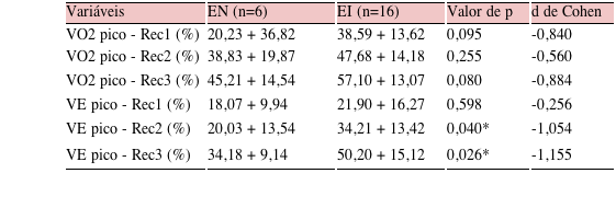 Quando analisados em níveis relativos (percentual de variação em relação ao pico), foi observado um comportamento similar ao observado na análise sobre os valores absolutos, isto é, maiores valores no EI. Apesar da diferença estatisticamente significativa não ter sido identificada em todos os minutos, os valores médios da variação percentual de VO2 e VE apontam para um desempenho pior no grupo EN (Tabela 2).