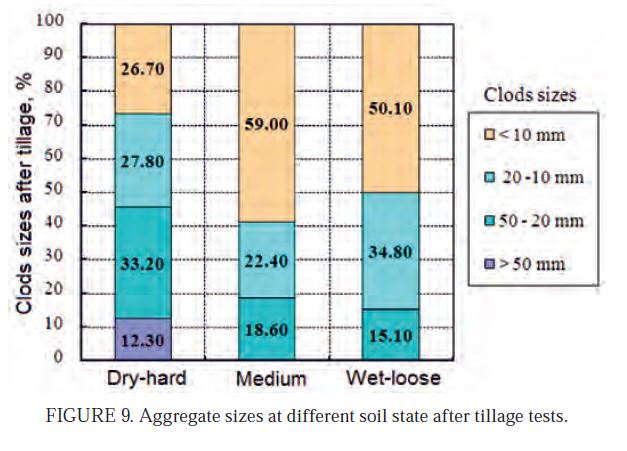 * The proportion of the aggregates with sizes less than 10 mm measured after tillage in three different soil conditions, called dry-hard, medium and wet-loose,vary with the soil state. As soil compaction increases the aggregates size after tillage also increase.