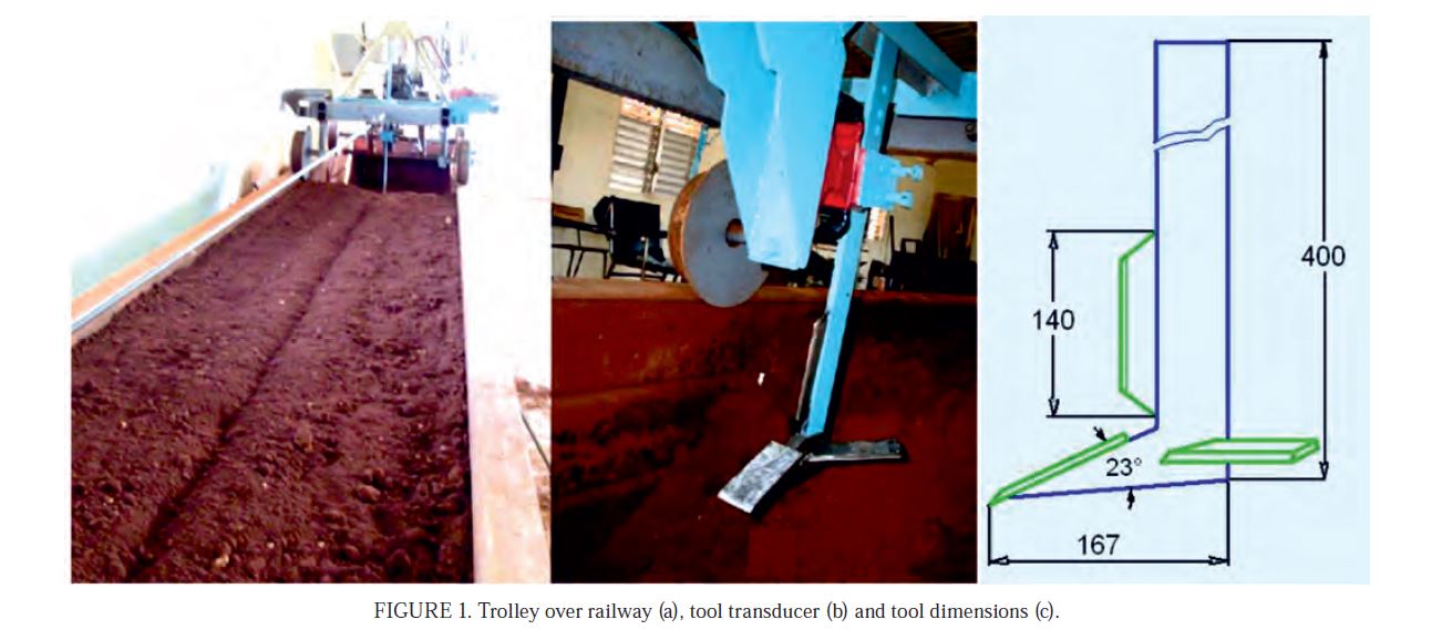 To measure the variation of tillage performance at different soil physical conditions, a longitudinal indoor soil-bin was used (Figure 1a). The effective working area was sized at 1.5 m width, 8.0 m length. The soil-bin was filled with Oxisol soil located in the occcidental region of the Cuban island. A multi-blade tool called cultivator was manufactured for the experiment. This tool was designed for operation in the upper layer of the soil (Figure 1c). Between the trolley and the tool was connected the transducer ring; the deformable device was set up at the centre work of the soil-bin. The system was mounted on steel wheels rolling over a steel railway; also a steel cable was used to connect the trolley to the gear reducer, getting a constant velocity of 3.6 km/h.