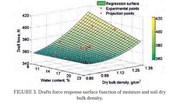 The influence of water content and dry bulk density in draft force response is shown in Figure 3. For all values of soil moisture under study when the dry bulk density increases, the draft force increases too. However, this increase for higher soil moisture w = 23%, is moderated in the range between 0.9 to 1.0 g/cm3).