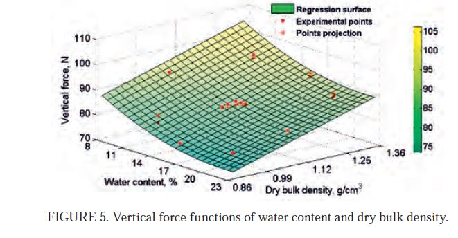Vertical force response surfaces as a function of dry bulk density and moisture content are shown in Figure 5. As it was expected, the force increases with soil become denser and decreases with water content. These results are in accordance with the variation in soil strength parameters like cohesion, friction and soil elasticity. The susceptibility of the soil to compaction, however, is related to factors as content of clay and the critical water content (Saffih-Hdadi et al., 2009).