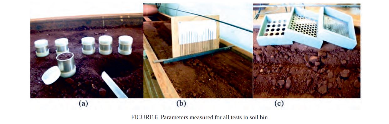 As indicators of soil loosening variations in the initial dry bulk density, soil profile and particle size distribution by the tillage operation were measured during each different test in the soil-bin. The final dry bulk density was obtained from the disturbed soil (Figure 6a), according to the procedure explained in section 2.4.