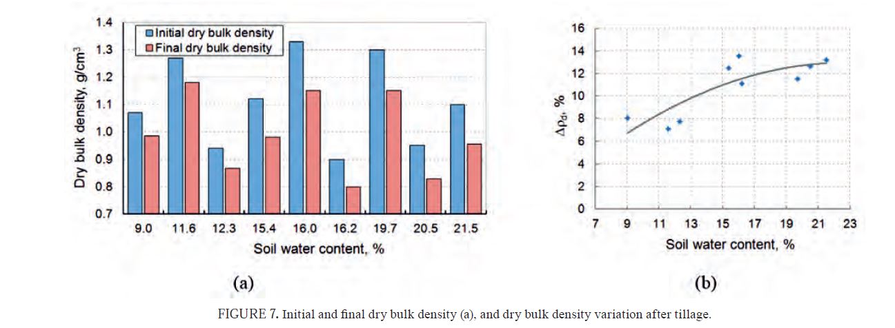 * By tillage operations, soil bulk density changes proportionally to the initial soil compaction. This variation also is affected by the water content. The height of soil profile measured in the transversal section of disturbed soil after tillage showed a linear correlation with the variation of dry bulk density.