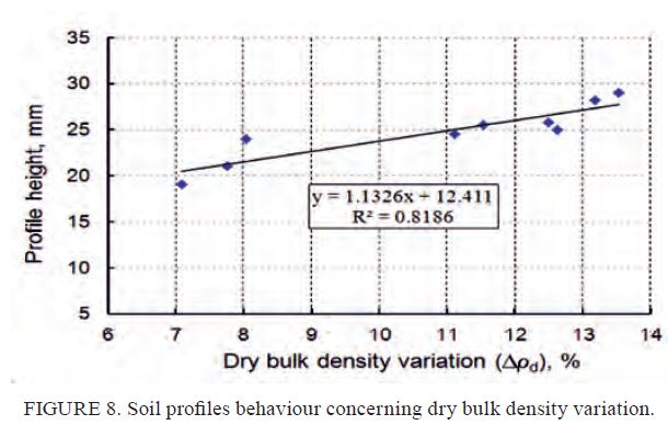 In the analysis, the variation of the profile height reached after each test was established as a function of the dry bulk density variation. The relationship shows a linear increase in the height of the soil profile with increasing Drd. The behaviour of the soil corresponds with the volumetric changes taking place in the soil granular structure during soil loosening.
