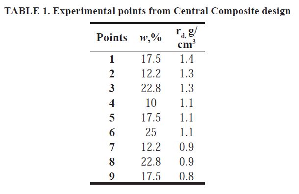 Focusing on the effect of changing soil moisture content and compaction level, the experiment was organised using a Central Composite design for these two elements. Soil water content and dry bulk density were combined at nine levels and four centre point replications. Table 1 shows the planned experimental combinations.