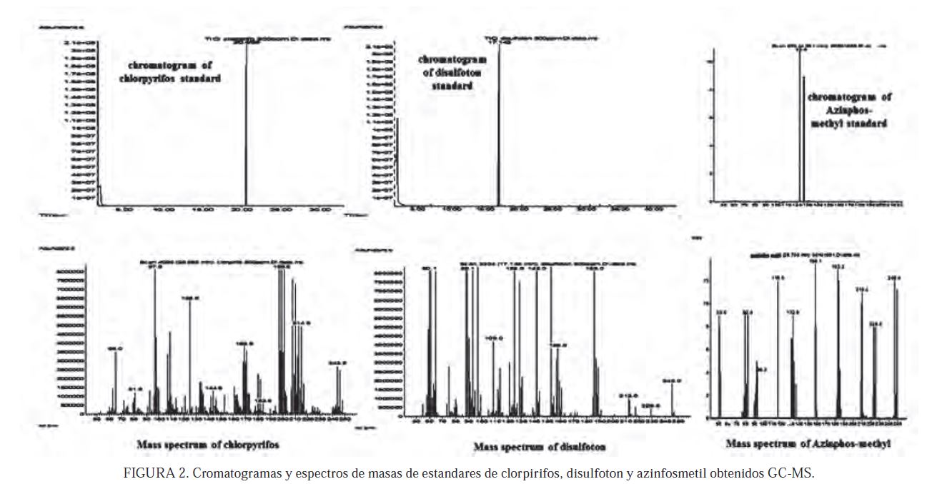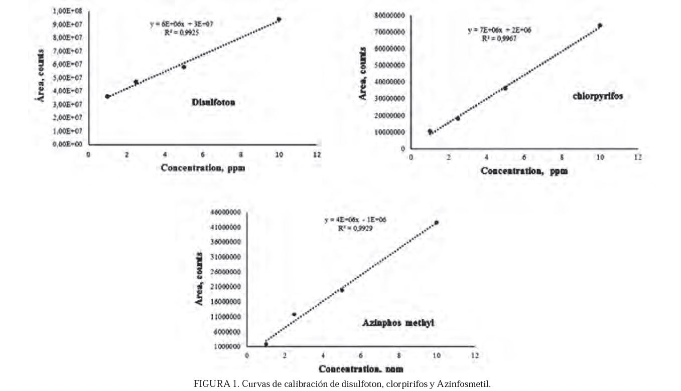 Método cromatográfico. La linealidad del método fue hecha sobre un intervalo de concentración de 1,0 a 10 µg / mL. Buena linealidad se obtuvo con la ecuación de regresión (y = mx + b) y los coeficientes de correlación de la regresión (R2 > 0,9925) para todos los compuestos. La curva estándar se realizó mediante el uso del área del pico cromatográfico de cada compuesto (Y) y la concentración (X). Las curvas de cada uno de ellos se pueden ver en la Figura 1. Mientras que, la Figura 2 muestra el cromatógrama típico y espectros de masas de disulfotón, clorpirifos y azinfosmetil obtenidos por GC-MSD.
