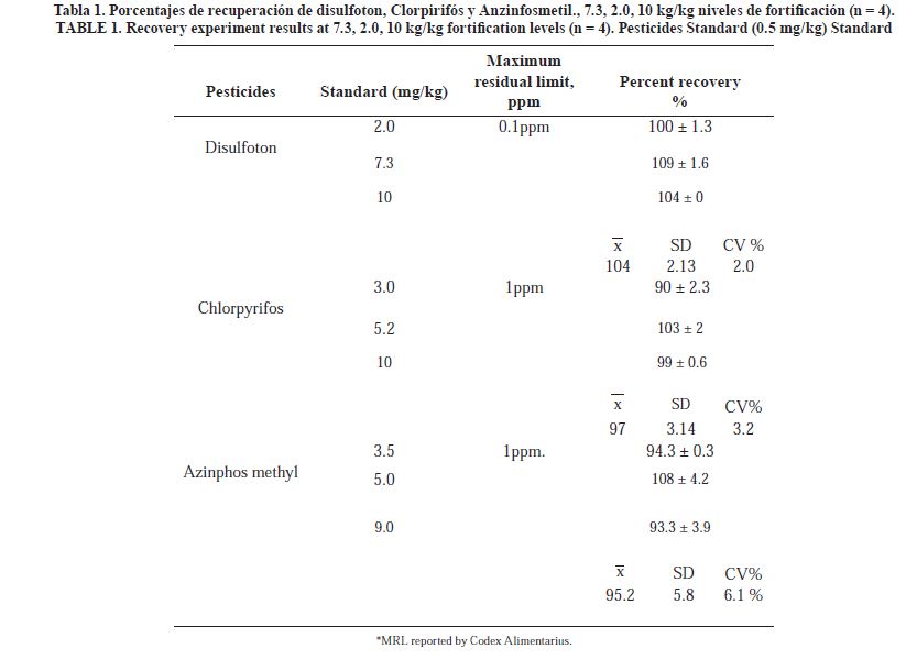 La Tabla 1 permite observar qué tan confiable es el método utilizado para la determinación de cada compuesto pesticida. Las recuperaciones obtenidas para los tres plaguicidas OF estuvieron de entre 80% a 109%, estos resultados están dentro del rango sugerido, de acuerdo con la regulación de la Comisión Europea, con valores de recuperación entre 70% y 120% (European Commission Health, 2005). Los resultados de la desviación estándar relativa (RSD%) estuvieron entre 0 a 12%, estos resultados están dentro del límite permitido residuos de pesticidas de acuerdo con SANCO (sanidad vegetal - residuos de plaguicidas) (Ravelo et al., 2008; European Comission Health, 2013). Los porcentajes de recuperación (%) obtenidos en esta investigación respecto a mango y papaya fueron consistentes con los reportados en investigaciones hechas en India, Kuwait, Brasil, Suecia, entre otros (Sharma et al., 2010).