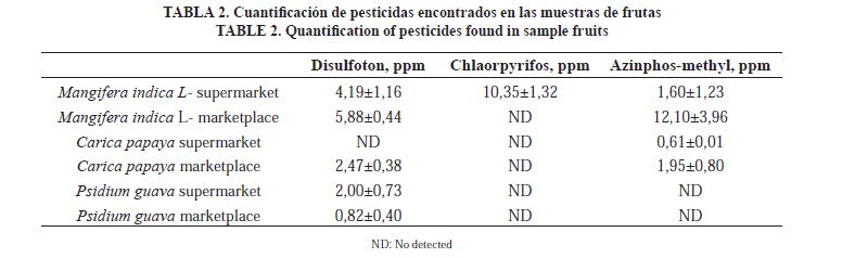 La Tabla 2 muestra los OF encontrados en los extractos de frutas. En este se encontraron residuos de OF que superen los límites máximos de residuos (LMRs), fueron encontrados en 3 muestras de frutas diferentes. Las muestras de guayaba tienen un menor número de OFs, sólo disulfoton fue encontrado, pero clorpirifos y azinfometil no fueron detectados. Disulfotón y Azinfosmetil estaban presentes en las muestras de mango y la papaya (de supermercado y mercado) superaron el LMR permitido. El clorpirifos se encontró sólo en mango obtenido en las muestras de supermercados (que superan el LMR permitido) (European Commission Health, 2013).