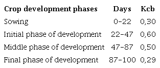 It is shown that there was an adequate correspondence between the crop evapotranspiration values considering both Kc with mean deviations of 0.30 mm d-1 and mean square error of 1.16 mm d-1, which represented a 6% relative error.
