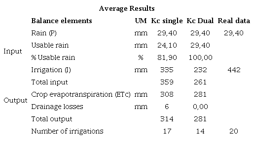 To evaluate the effects caused by the use of the single Kc and dual Kc coefficients, a comparative water balance was carried out for both methods (Table 3.2).