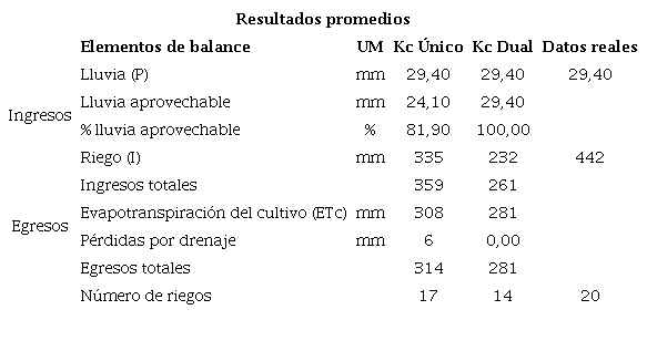 The average water needs estimated through the balance by means of the single Kc for the potato crop were 25% higher compared to the estimates made for a single dual coefficient, this was due to the fact that the total irrigation norm was higher by 83 mm, accounting for 3 more irrigations. When comparing with the actual exploitation of these irrigation systems, 180 mm more than the irrigation standard were applied, accounted for in the application of 6 average irrigations higher than those reported by the balance.