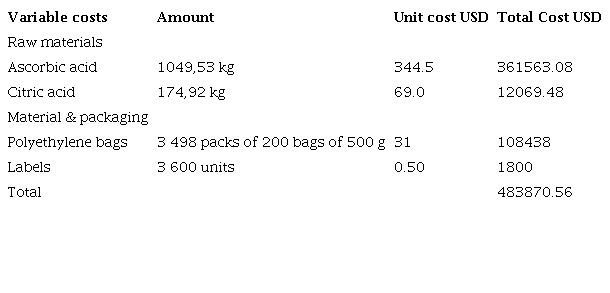 Among the variable costs are the raw materials, which correspond to the ingredients that will be part of the banana pulp, such as ascorbic acid and citric acid; in addition to the packaging material that will be in contact with food (Table 2). In this case, the main raw material (banana) is not taken into account in the process, as this is nothing more than the fruit rejected during exportation in the enterprise, hence the cost of the same can be disregarded.