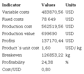 Within the parameters that indicate the behavior of production and allow evaluating its economic efficiency, is the value of production (Table 1). This is determined taking into account the production process for the banana pulp described above, their respective yields per activity and the amount of banana rejected in one day (raw material to be processed). Based on the quantity of bananas rejected daily in the enterprise (1,200 kg), a daily production of 958 kg of finished product is estimated, which is equivalent to 1,916 500-g bags. The final product is the frozen pulp sealed under vacuum, in such a way that the nutritional properties of the fruit can be preserved, pretending to be commercialized in the local market at a price of 2 USD/ kg.