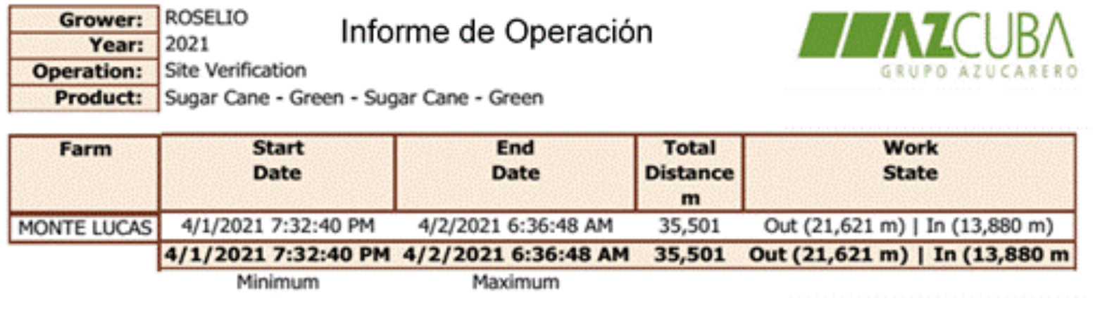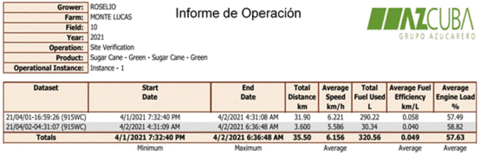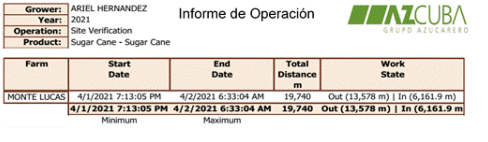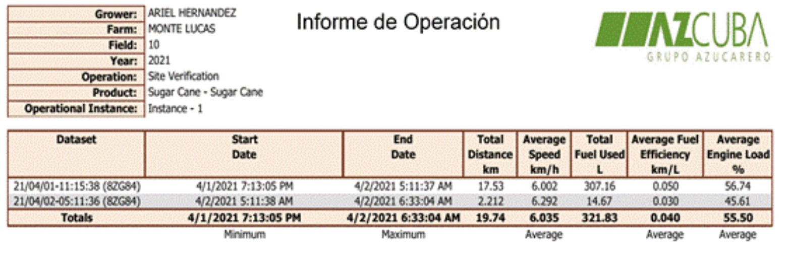 In this report, the main results of the intervention in the harvesters under study are shown within the framework of the project that allows validating the efficiency of the collection system and the processing of the data obtained by the performance monitor, through the SMS Advanced software (Ag Leader Technology, 2021). In addition, the training tasks carried out for the management of harvest data to the personnel of “Héctor Rodríguez” Sugar Mill and its publication in the Spatial Data Infrastructure (IDE) developed for AZCUBA from a research and development project are described. As part of the training carried out to the company's personnel, some analyses of interest are carried out. They were trained in the use of SMS and potential solutions are proposed based on remote sensing to detected problems. Finally, a series of final considerations and recommendations are given for the system execution effectiveness.