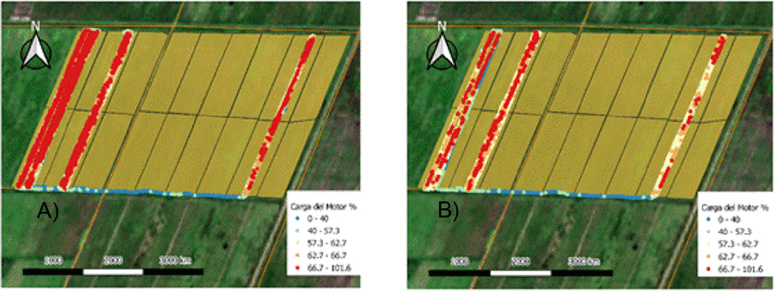 One of the variables of greatest interest to analyze the operational efficiency of agricultural machinery is fuel consumption (Ramos et al., 2016). In this case, the reports shown previously were generated in an automated way, with the aim of verifying that, despite the consumption of both machines being similar, the value differs with the external measurements of the "fleet control" in the order of 30 liters of fuel. In order to validate the sensing carried out by the harvester's own system, maps of the variable “engine load” were also made, since this parameter is closely related to fuel consumption. In Figure 4, the variable load of the motor of both harvesters is represented separately.